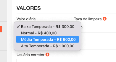 Os valores de diária, configurados no cadastro do imóvel são exibidos no campo Valor diária e é possível selecionar uma das opções ou editar o valor: