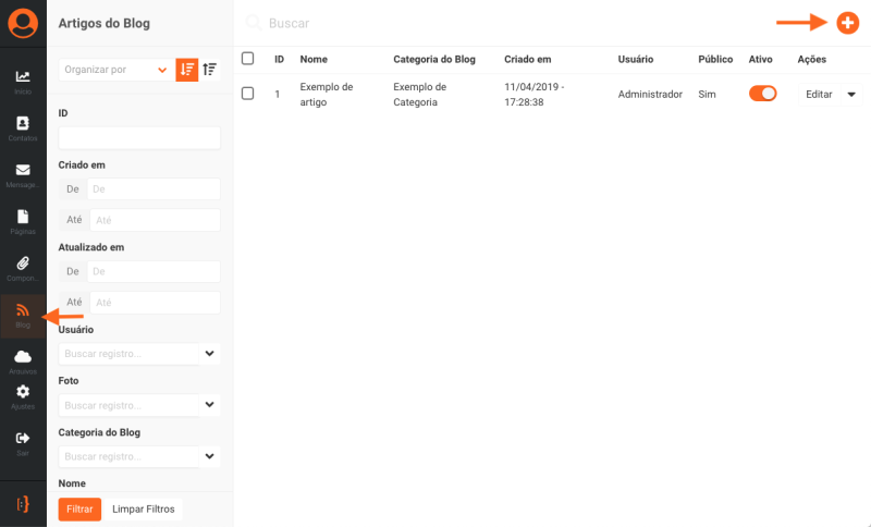 Para acessar o módulo, no menu principal clique em Blog. O sistema irá exibir a lista com os posts já cadastrados no sistema. Para adicionar um novo, clique no botão Adicionar, no canto superior direito da tela, conforme a imagem abaixo: