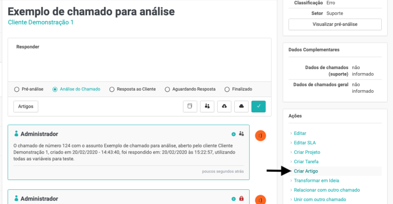 Caso você queira transformar o chamado em um artigo, na página do chamado, nas ações clique em Criar Artigo, conforme a imagem abaixo: