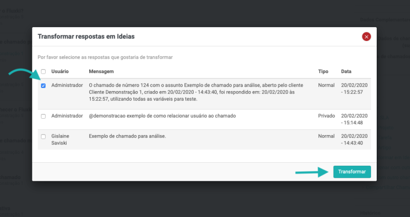 Em seguida, selecione as mensagens que deseja transformar em ideia e clique em Transformar: