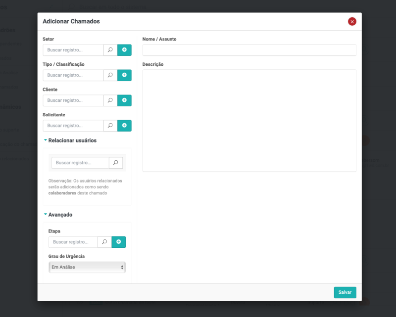 Neste campo você poderá relacionar os usuários relacionados ao chamado. Poderá selecionar diversos usuário, conforme necessário.