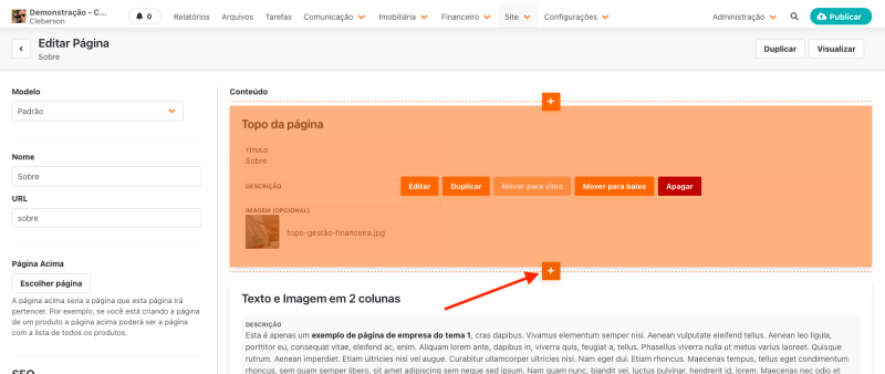 Neste exemplo vamos adicionar o vídeo na páginas sobre a imobiliária, logo abaixo do topo da página: