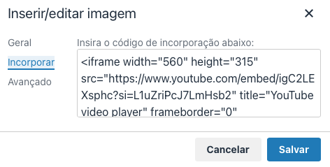 Cole o código que você copiou do YouTube no campo incorporar, conforme a imagem abaixo: