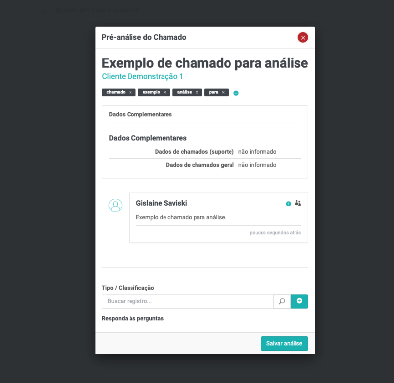 Quando o sistema recebe o chamado, por padrão será necessário fazer a análise do chamado. Quando o agente de suporte executar a rotina de análise, a tela abaixo será exibida: