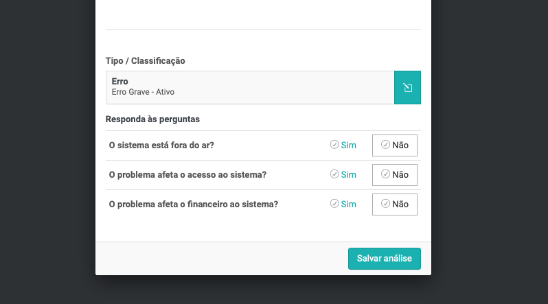 Em nosso exemplo, o chamado foi classificado como “Erro" e as perguntas cadastradas são: