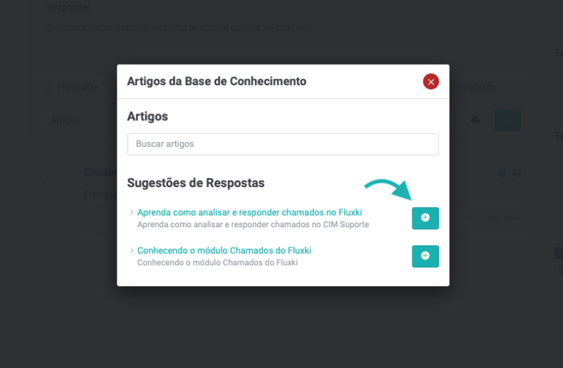 Em seguida, selecione os artigos desejados, clicando no botão + para adicionar na resposta do chamado: