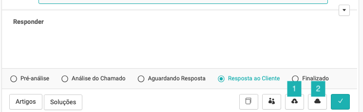 Além das imagens, você pode enviar anexos aos chamados. Para enviar os arquivos, clique nos ícone (1) para escolher um arquivo do seu dispositivo ou (2) escolher da biblioteca do sistema: