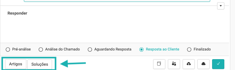 Além das respostas prontas, o sistema exibe sugestões de respostas, com base nas tags do chamado. Essas sugestões são artigos da base de conhecimento.