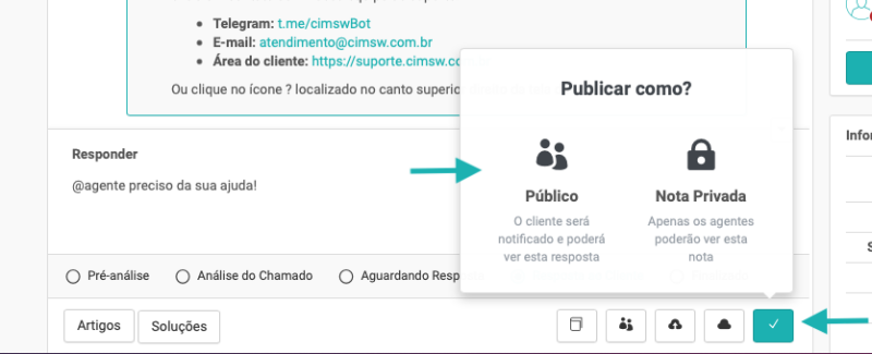 Você poderá escolher entre resposta pública ou privada. A resposta pública, será enviada ao cliente e a nota privada, somente para quem tem acesso ao chamado (agentes internos).