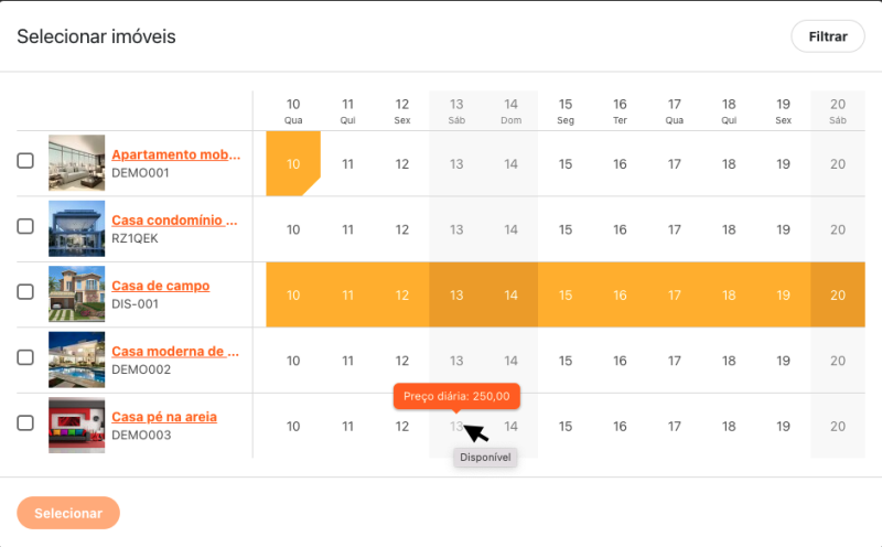 Ao passar o cursor (mouse) sobre os dias é possível visualizar o valor da diária e a disponibilidade.