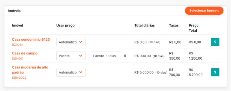 Para adicionar o pacote no imóvel, ao lado do preço total clique no ícone $.