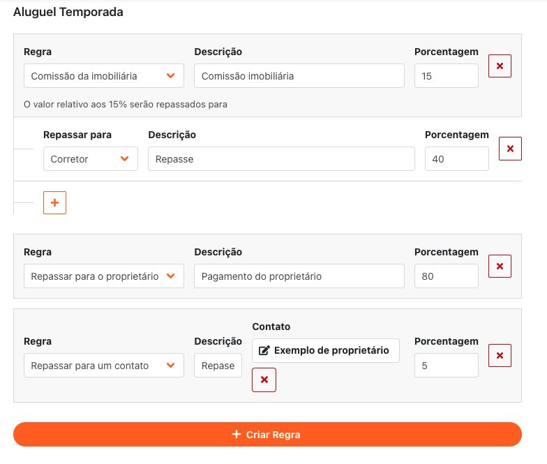 - Repassar para o proprietário: Percentual do valor do aluguel que será repassado ao proprietário do imóvel (o contato que foi configurado no cadastro do imóvel);