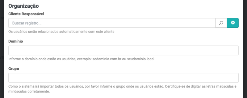 - Cliente responsável: O sistema organiza os usuários em clientes, então neste campo selecione o cliente ao qual deseja relacionar os usuários importados do Active Directory;