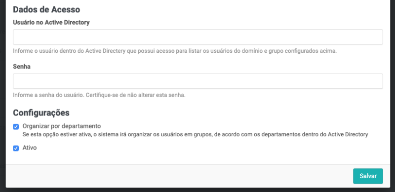 - Caso o usuário já exista no sistema, ele será atualizado de acordo com as informações do AD (exceto as permissões e tipo do usuário).