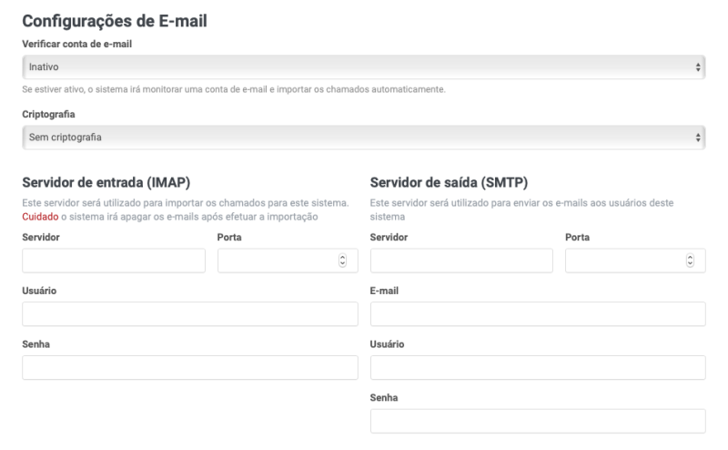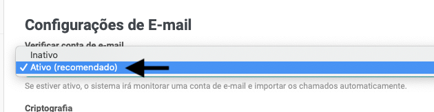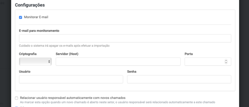 Ao ativar a opção de monitorar o e-mail, o sistema irá habilitar as configurações do servidor de entrada.