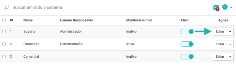 O sistema irá exibir a lista de setores cadastrados no sistema. Clique em editar, no setor desejado, conforme a imagem abaixo: