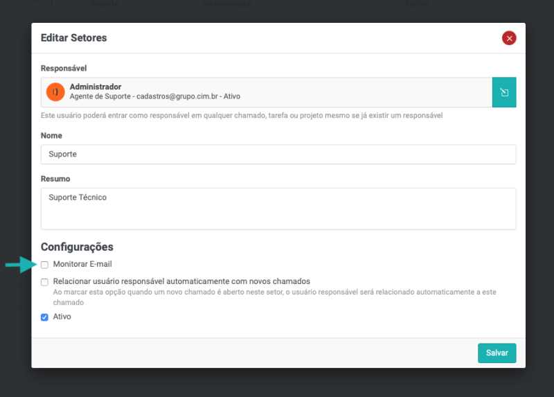 No formulário de cadastro do setor, selecione o item Monitorar E-mail: