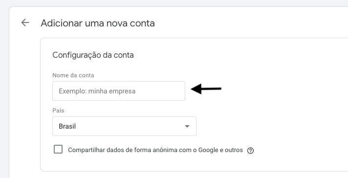 Informe o nome da conta. Uma sugestão é inserir o nome da empresa, site ou projeto que será configurado.