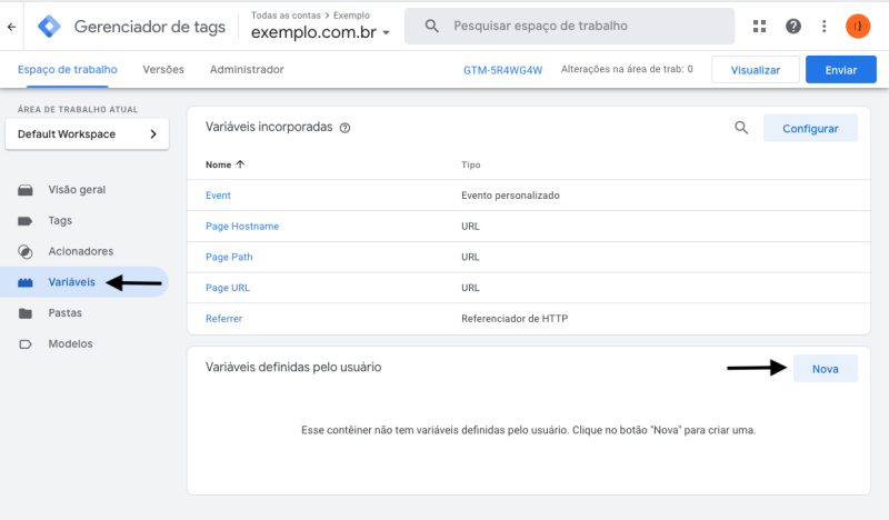 Após criar a conta e configurar o contêiner, será necessário configurar as variáveis. Acesse a conta criada e clique em variáveis.
