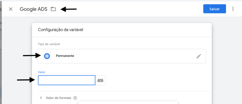 Em nosso exemplo vamos configurar a variável do Google Ads. Nesse caso o tipo será Permanente.
