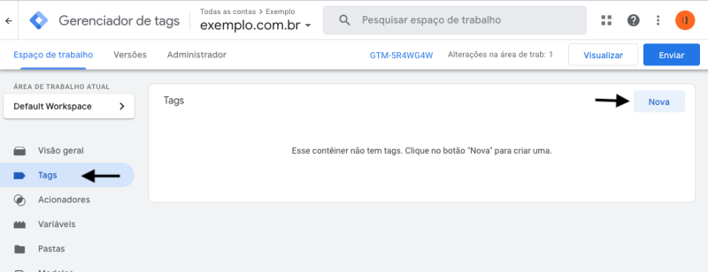 Após criar a variável será necessário configurar a tag. Para isso, clique em Tag no menu principal e em Nova:
