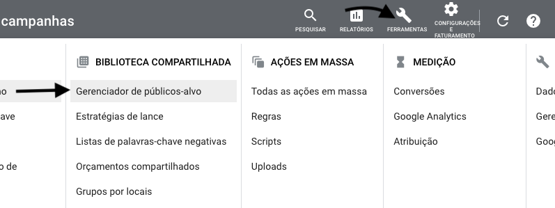 Acesse o menu Ferramentas e em Biblioteca Compartilhada, acesse o Gerenciador de públicos-alvo: