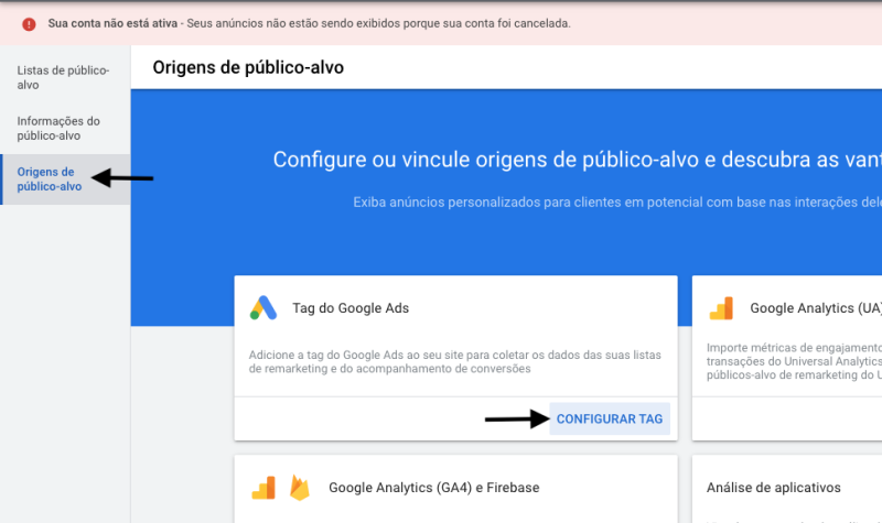 Em seguida, clique em Origens de público-alvo. Na opção Tag do Google Ads, clique em Configurar Tag: