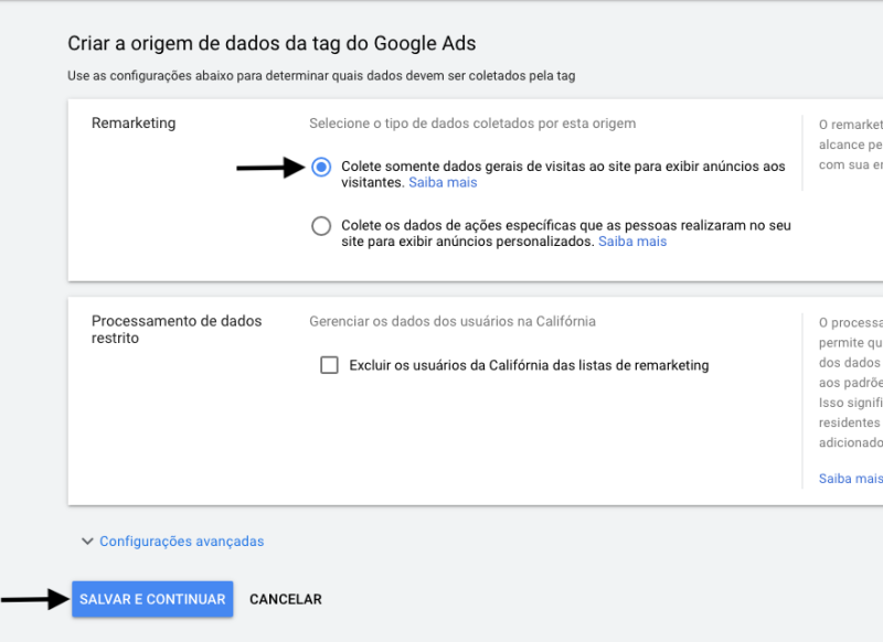 Na próxima tela, selecione o tipo de dados que serão coletados e clique em Salvar e continuar:
