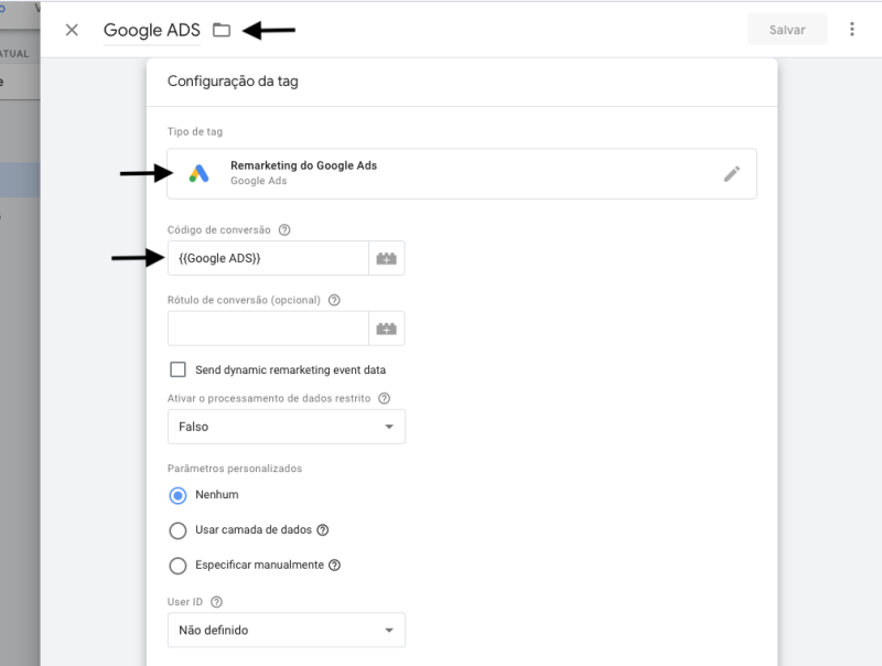 O ID de conversão deverá ser configurado no Tag Manager, no campo Valor.