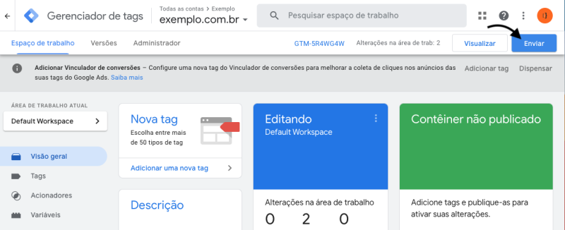 Com a variável e a tag configurada, será necessário publicar o contêiner. Para isso, clique em Enviar.