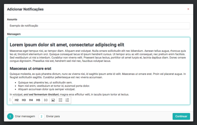 Para enviar a notificação, acesse o módulo e clique no botão (+). A página de cadastro do conteúdo da notificação será exibido. Preencha o assunto e a mensagem que deseja enviar.