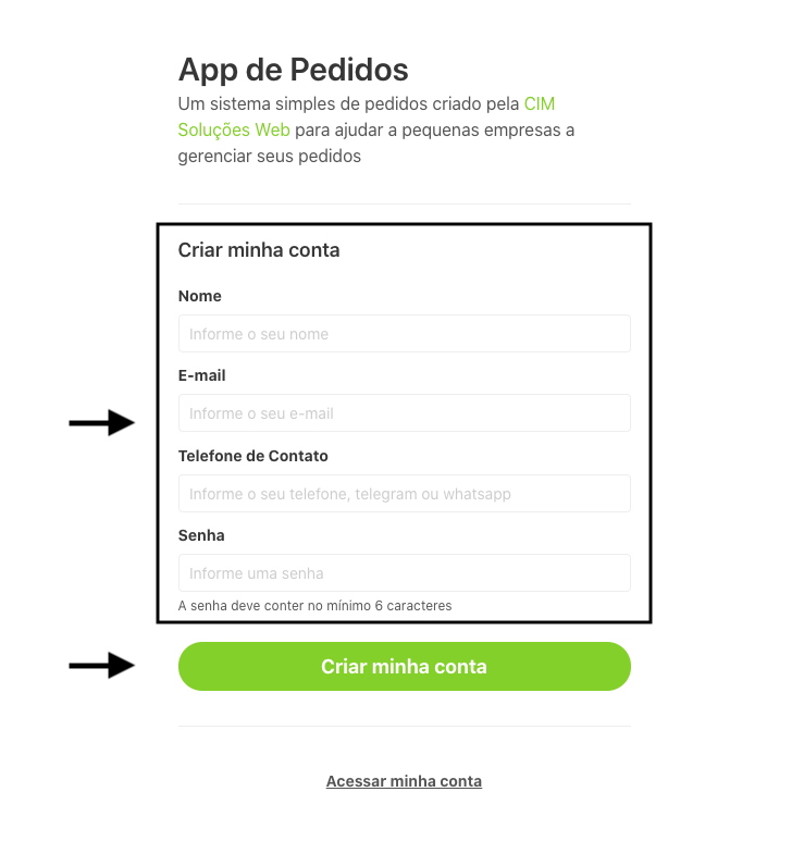 - Senha: Informe a senha desejada. Ela será usada para acessar a sua conra e enviar os pedidos.