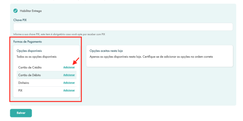 - Clique em Adicionar, ao lado de cada forma de pagamento desejada.