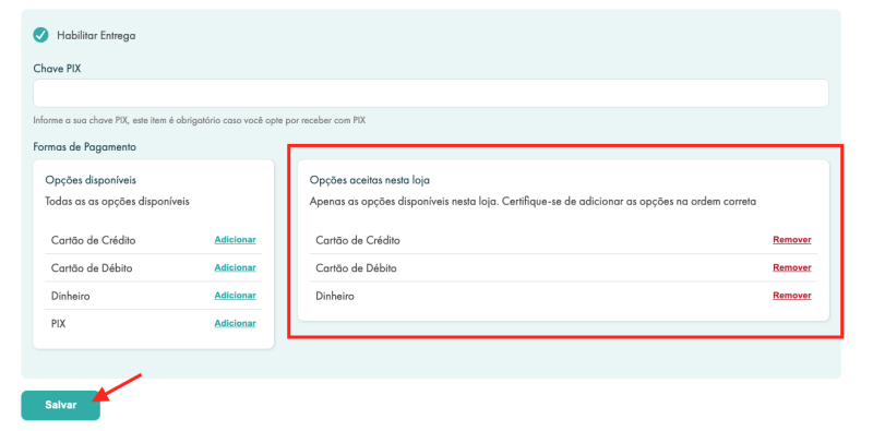 - As formas de pagamentos aceitas, serão listadas ao lado. Você poderá removê-las, se necessário.