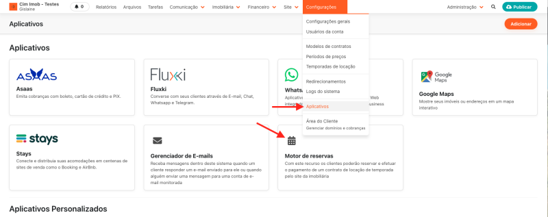 Faça o login na sua conta do Cim Imob e em seguida, no menu principal acesse a área de Aplicativos (Configurações > Aplicativos).