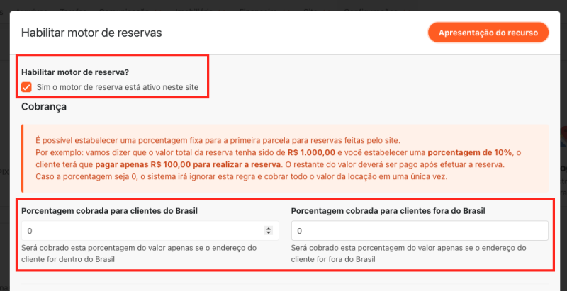Você poderá definir uma taxa ou deixar o campo zerado para receber o valor total no ato da reserva (quando o cliente efetuar a reserva através do site).