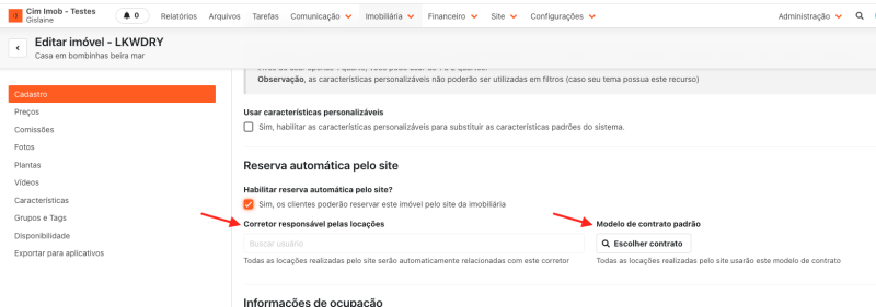 No formulário de cadastro do imóvel, encontre a opção Reserva automático pelo site e marque o checkbox para habilitar o imóvel.
