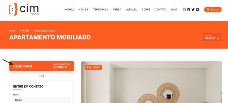 2. Em seguida, irá clicar no botão de Reservar, que será exibido apenas nos imóveis que foram liberados no sistema: