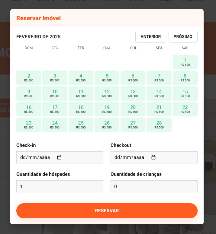 3. Nesse tela será exibido o calendário de disponibilidade do imóvel e os campos de Check-in, Checkout, nr. de hóspedes e crianças.
