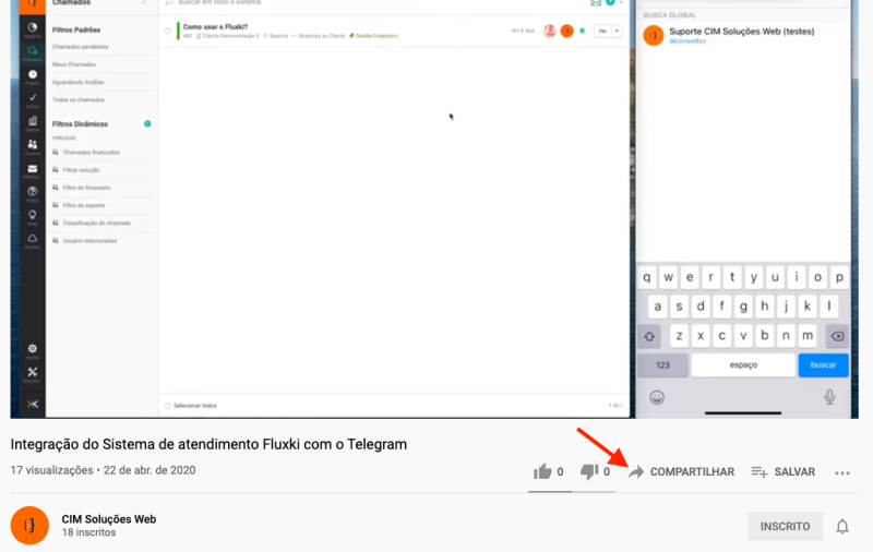 Acesse o YouTube e encontre o vídeo que deseja adicionar o post. Abaixo do vídeo, clique em Compartilhar: