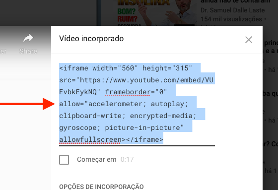Em seguida será necessário copiar o código (iframe) do vídeo que deseja inserir no post.
