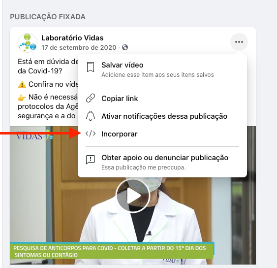 Encontrou a publicação com o vídeo? Clique nos três pontinhos ao lado da publicação que tem o vídeo e, em seguida, clique em Incorpoarar: