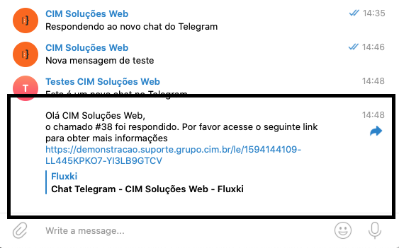 Seguindo estes passos, o chamado será registrado no sistema como chat e o usuário receberá a mensagem diretamente no Telegram: