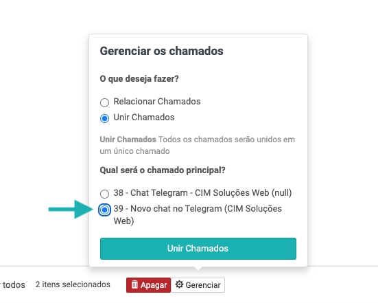 Para utilizar a função Unir chamados, disponível no Fluxki, sem perder o vínculo com o Telegram, é necessário escolher o chat ativo como o principal.