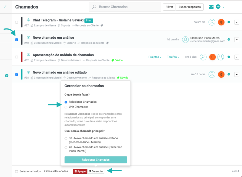Para relacionar chamados, selecione os chamados desejados, e clique em “Gerenciar”, conforme imagem abaixo: