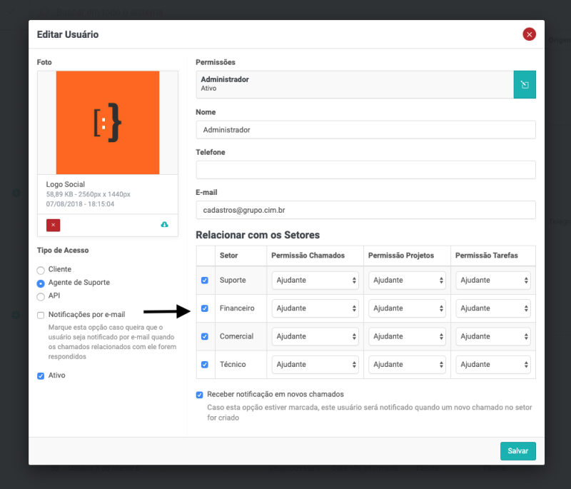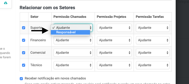 Atenção: caso você não selecione nenhum setor, o usuário terá acesso aos chamados de todos os setores do sistema