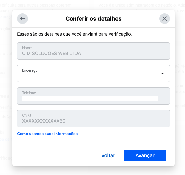 Atenção: Informe os dados conforme registrado no contrato social da sua empresa. Caso os dados informados nesse formulário sejam divergentes a verificação poderá ser negada pela Meta (Facebook).
