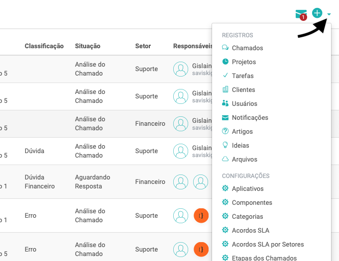 Por exemplo, ao cadastrar um novo chamado, ao buscar o cliente e não encontrar na lista, clique no botão (+) para adicionar o novo cliente. Desta forma, você não precisará sair da tela de cadastro do chamado para adicionar um novo cliente.