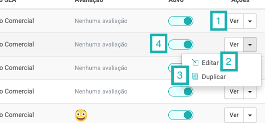 Todas as listas do sistema são padronizadas, facilitando o aprendizado de uso do sistema. Os botões de ação estão localizados no lado direito do registro, onde você poderá (vide imagem):