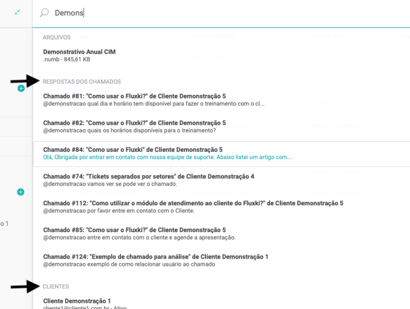 Com o campo de buscas do Fluxki, você poderá pesquisar qualquer informação no sistema. Basta pesquisar por palavra ou frases, que o sistema irá exibir onde a palavra está sendo usada.